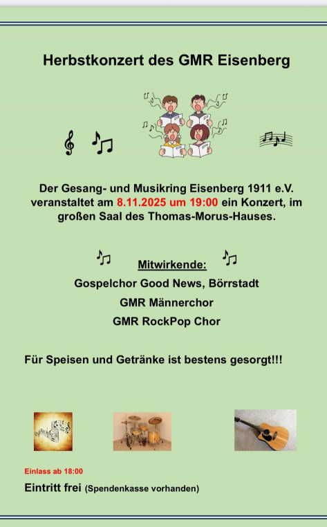 Der Gesang- und Musikring Eisenberg sieht seine Aufgabe darin, eine kulturelle Bereicherung für Eisenberg zu sein. Er veranstaltet daher Konzerte, Benefizveranstaltungen und bietet Gelegenheiten zum geselligen Zusammenkommen.
